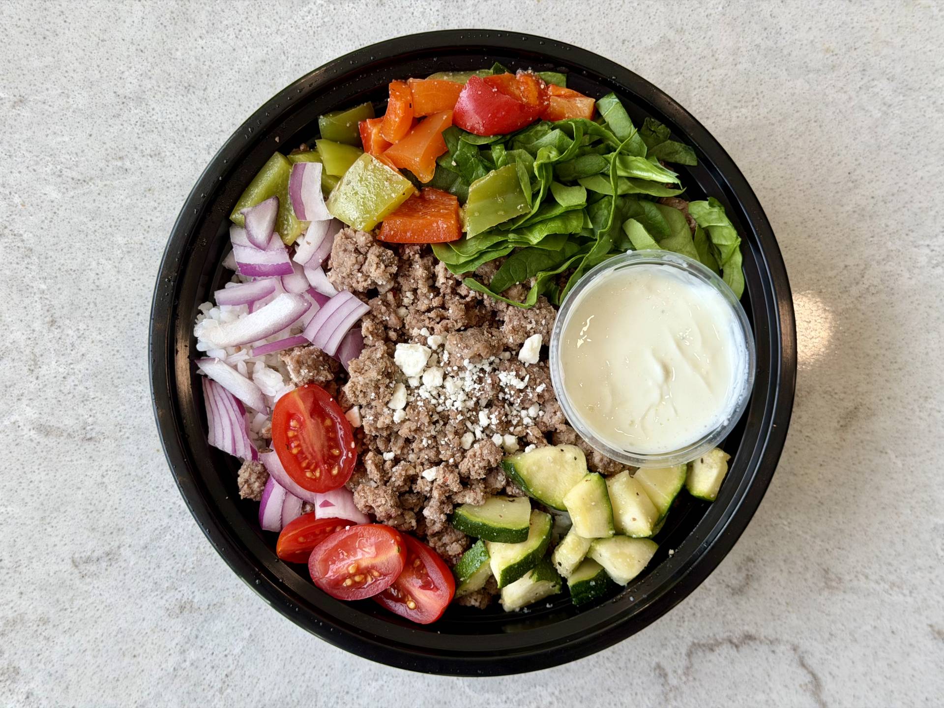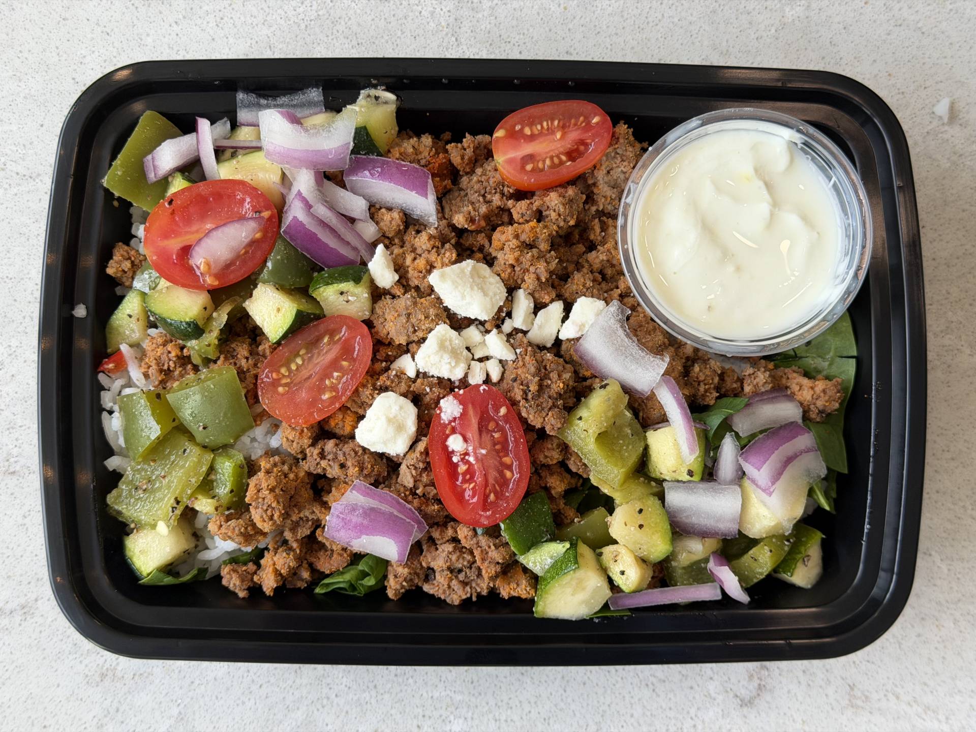 Cooked Ground Beef, White Rice, Feta Cheese, Zucchini, Peppers, Onion, Spinach, Cherry Tomato, Lemon Pepper Non Fat-Greek Yogurt.