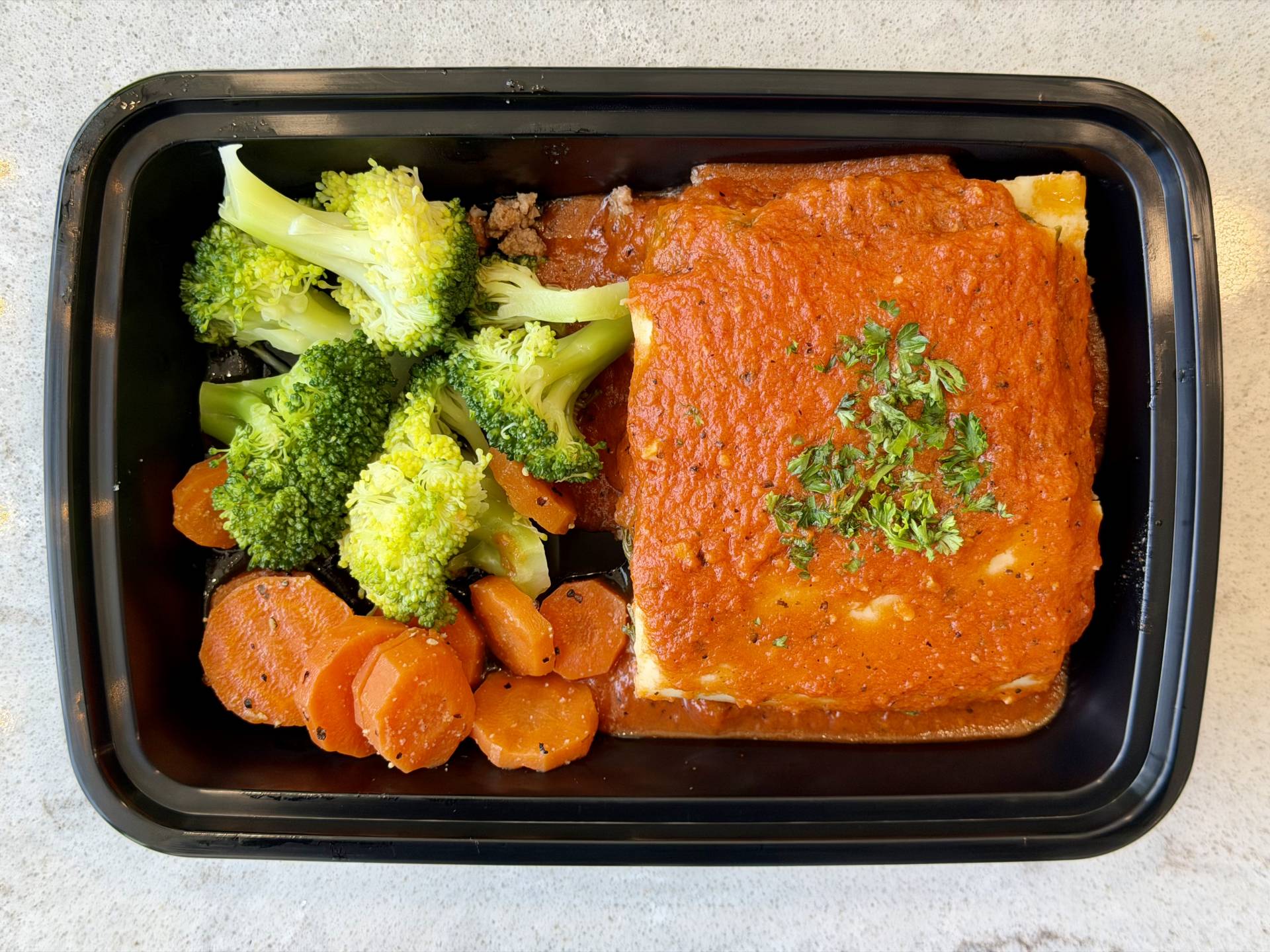 Ground Beef, Mozzarella Cheese, Lasagna Pasta, Broccoli, Spinach, Carrots, Marinara Sauce on Top, Parsley.
