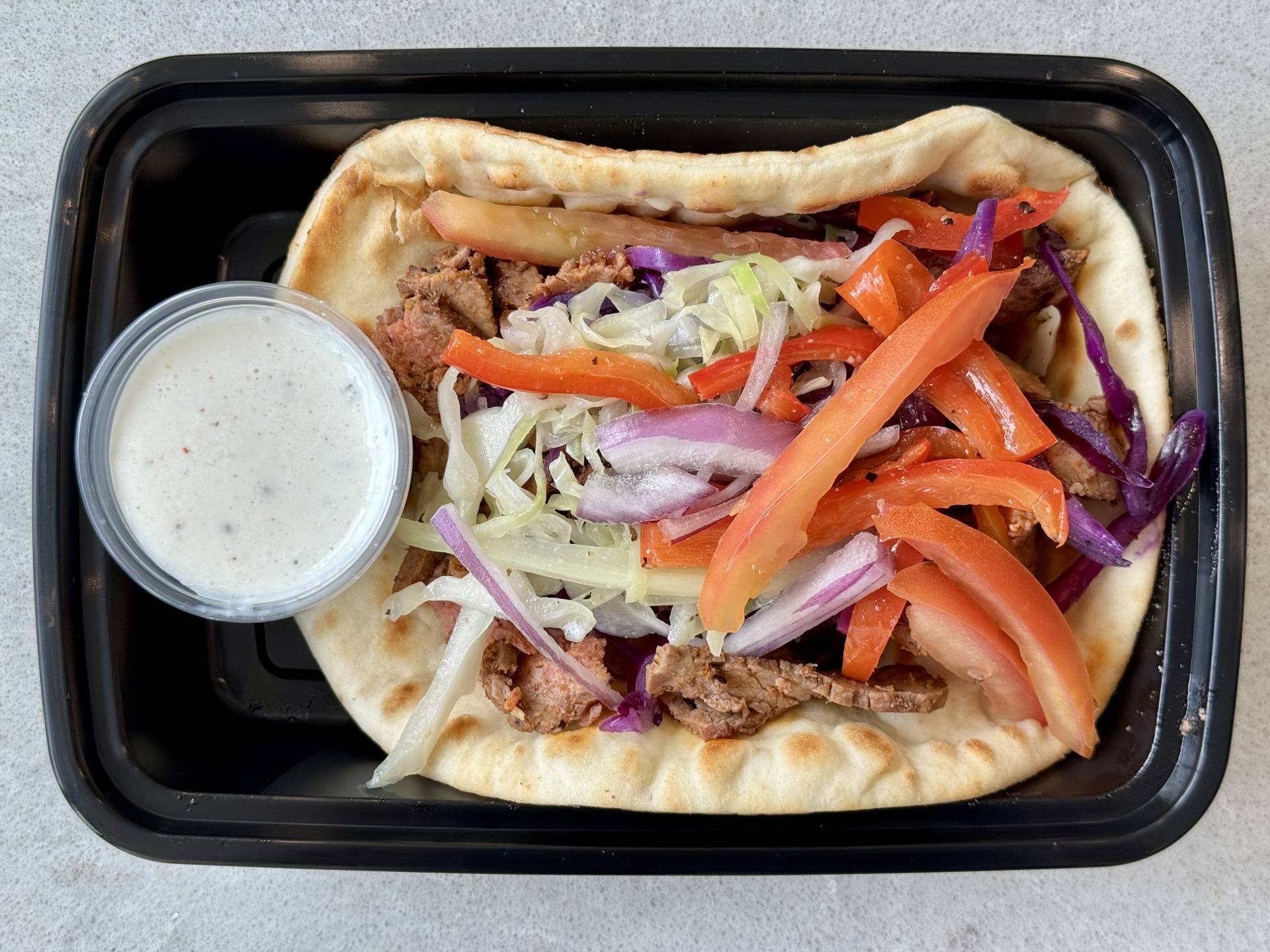 Grilled Steak, Thin Pita Bread, Red Onion, Tomato, Cabbage, Red Peppers, Tzatziki Sauce.