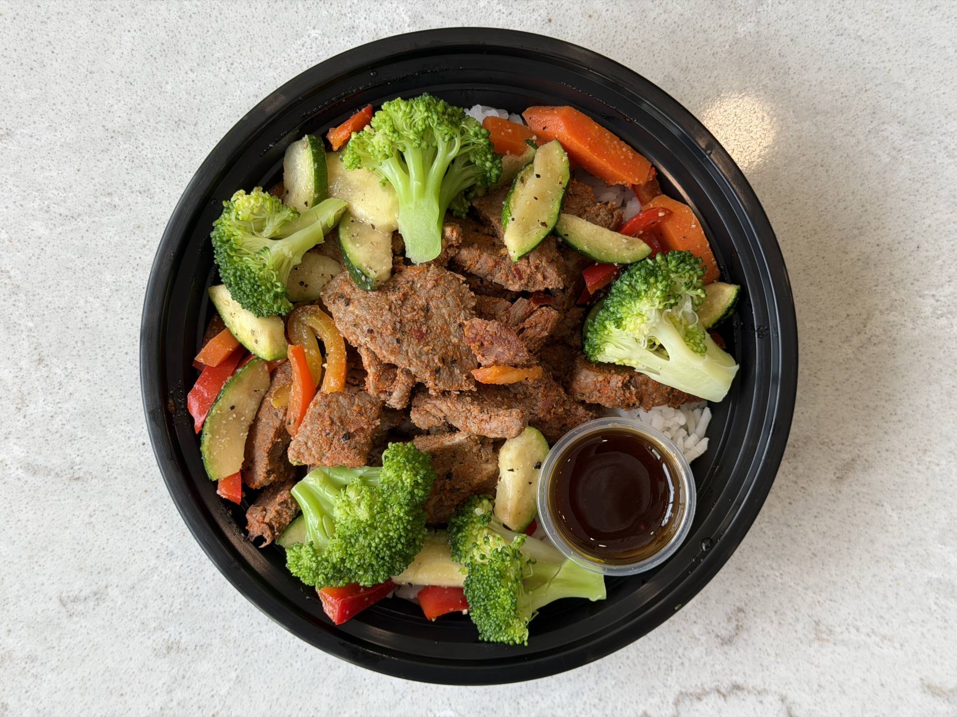 Cooked Steak, White Rice, Zucchini, Carrots, Red Peppers, Broccoli, Side of Spicy Teriyaki Sauce.
