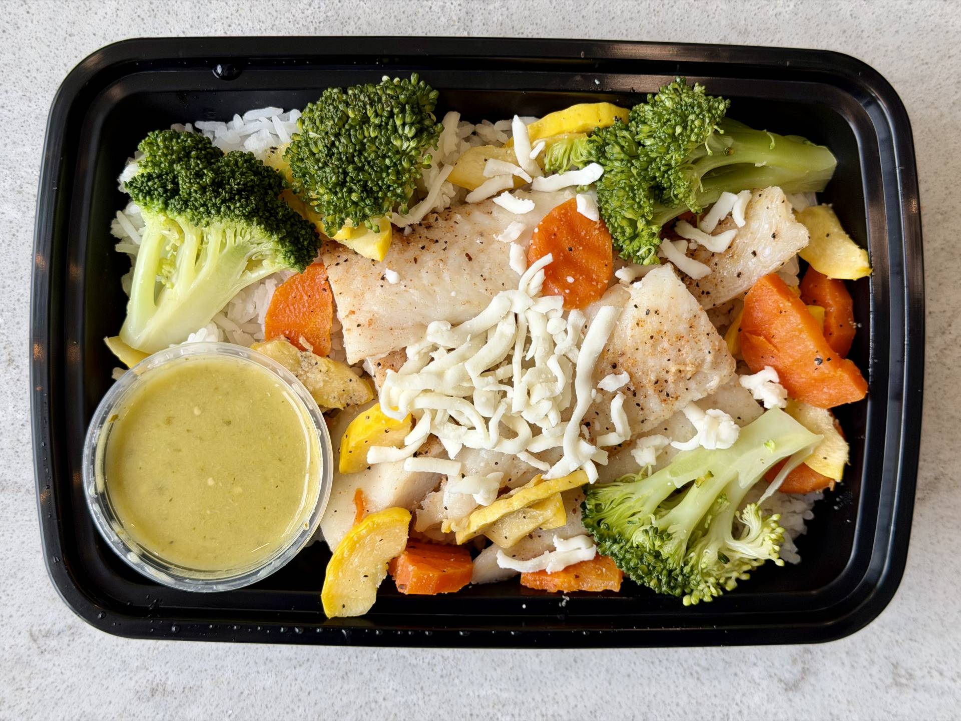 Oven Cooked White Fish, Mozzarella Cheese, White Rice, Yellow Squash, Carrots, Broccoli, Side of Salsa Verde.
