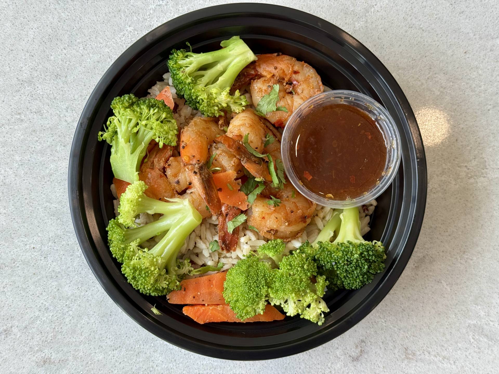 Cooked Shrimp, Wild Rice, Carrots, Broccoli, Side of Spicy Apricot Sauce.