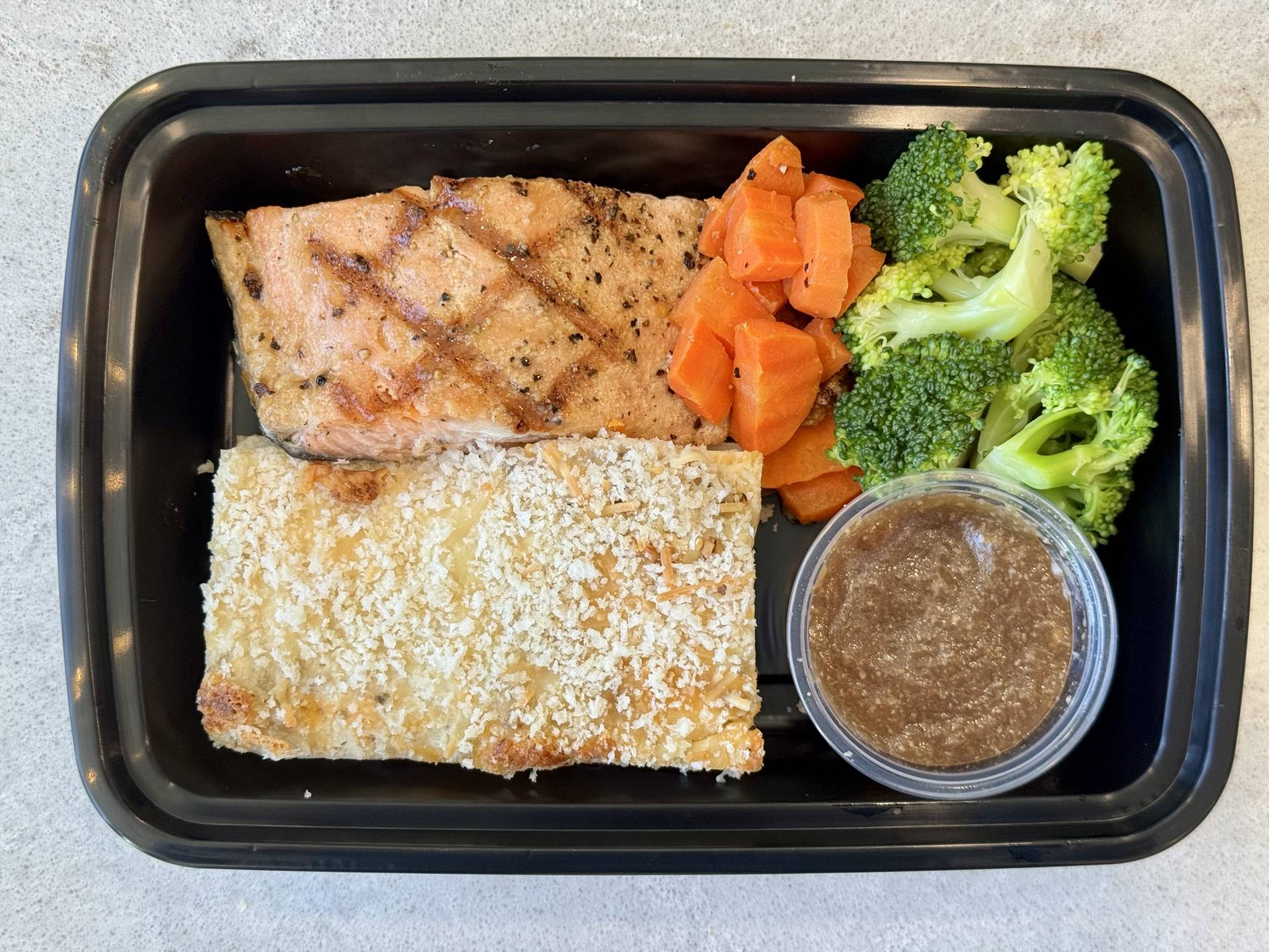 Grilled Salmon, Potato Casserole, Broccoli, Carrots, Side of Garlic Sauce.
