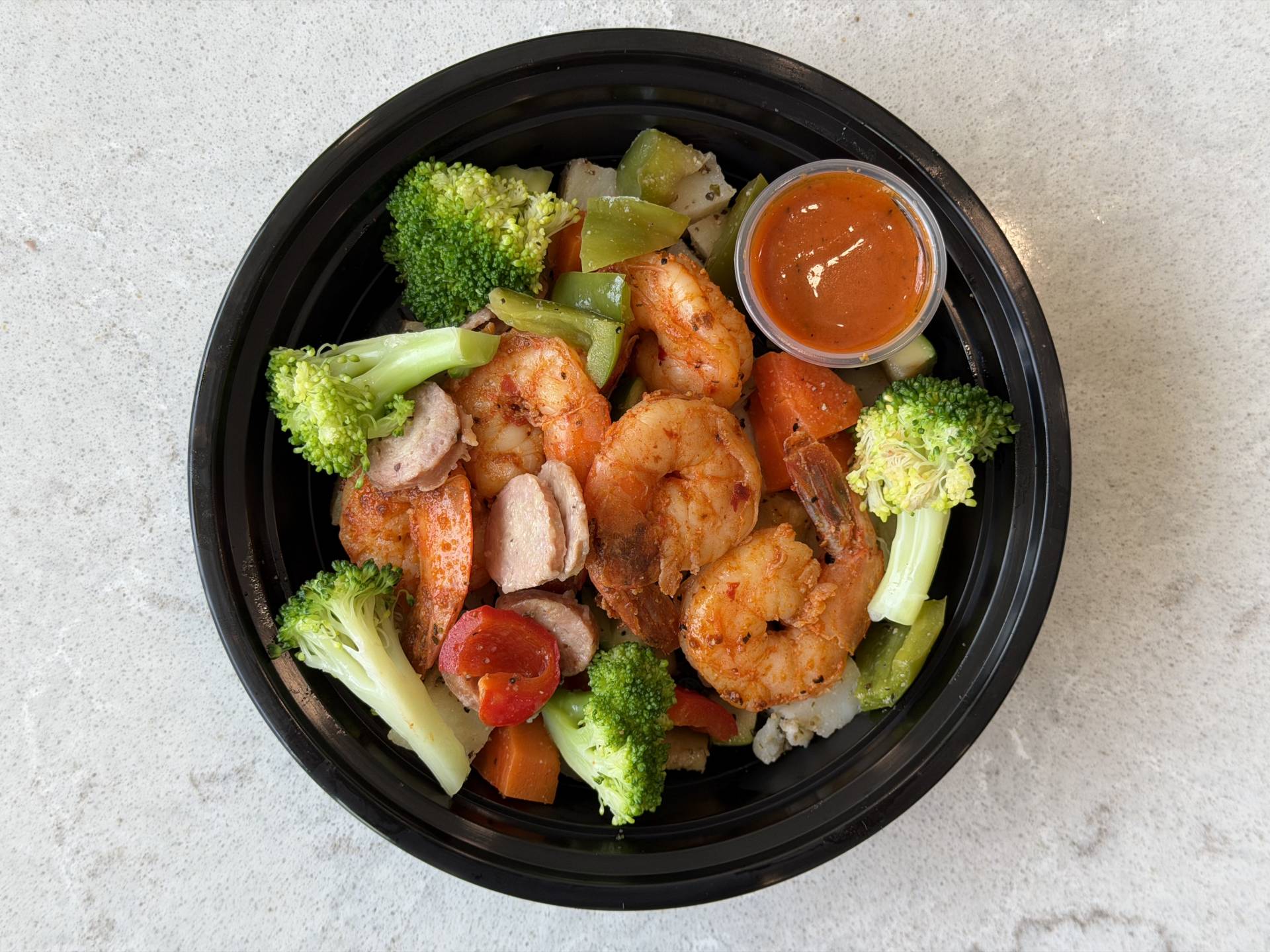 Cooked Shrimp, Sliced Chicken Sausage, Oven Roasted Potatoes, Zucchini, Peppers, Carrots, Broccoli, Side of Red House Sauce.