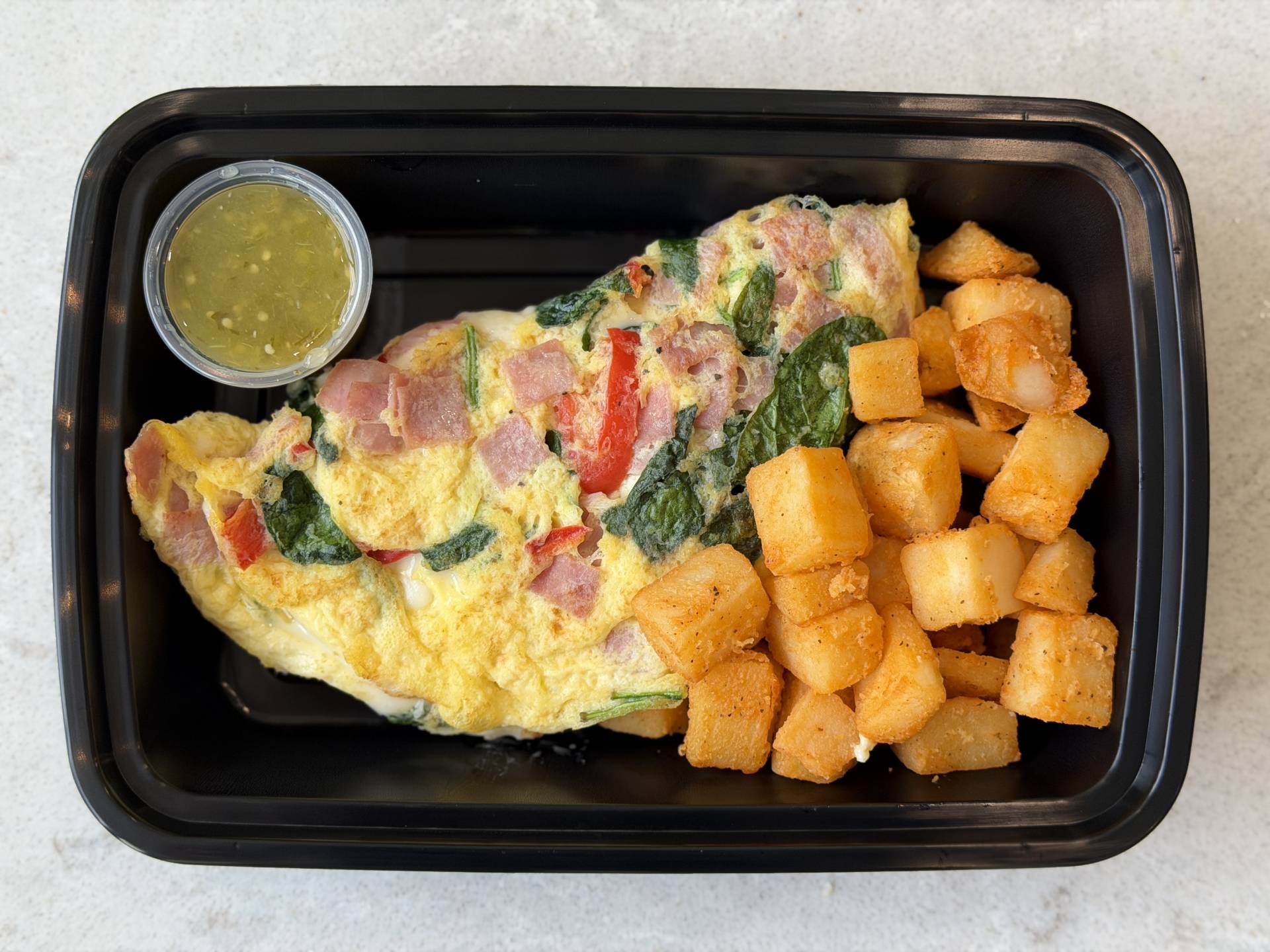 Whole Eggs, Turkey Ham, Mozzarella Cheese, Country Potatoes, Spinach, Peppers, Side of House Sauce