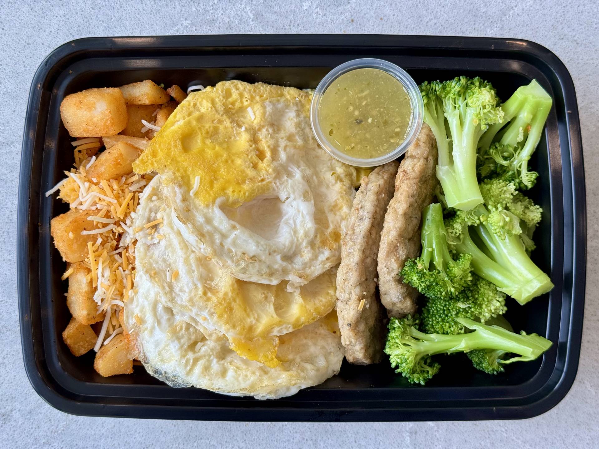 3 Over Hard Egg, Chicken Sausage Patty, Cheddar Cheese,Country Roasted Potato, Broccoli, House Sauce.