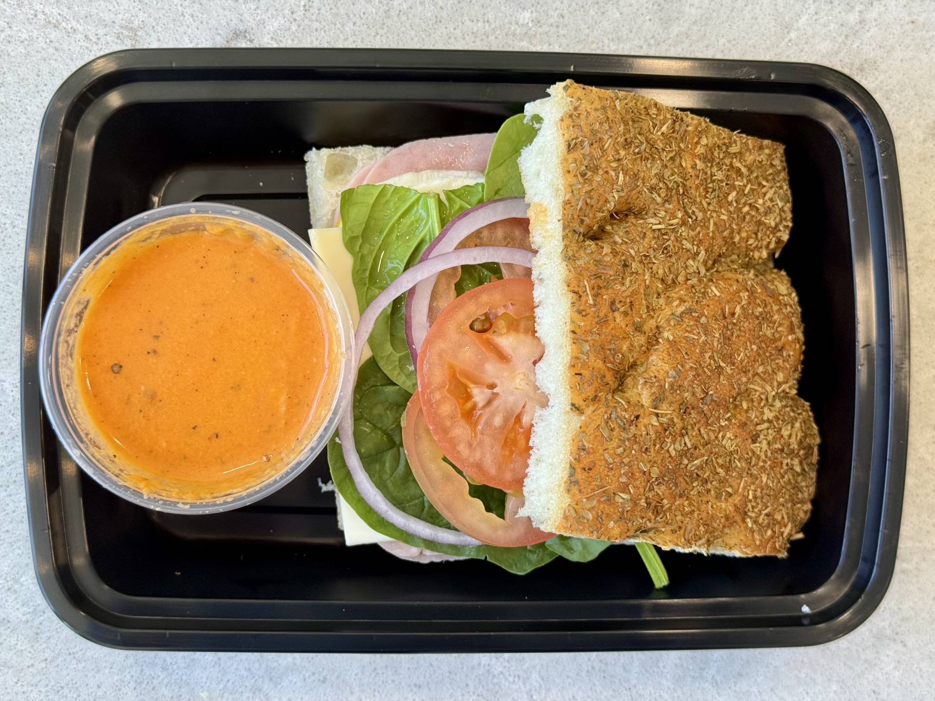 Over Hard Egg, Turkey Ham, American Cheese, Focaccia Bread with Italian Herbs, Chipotle Aioli, Spinach, Tomato, Onion, Tomato Soup on the Side.