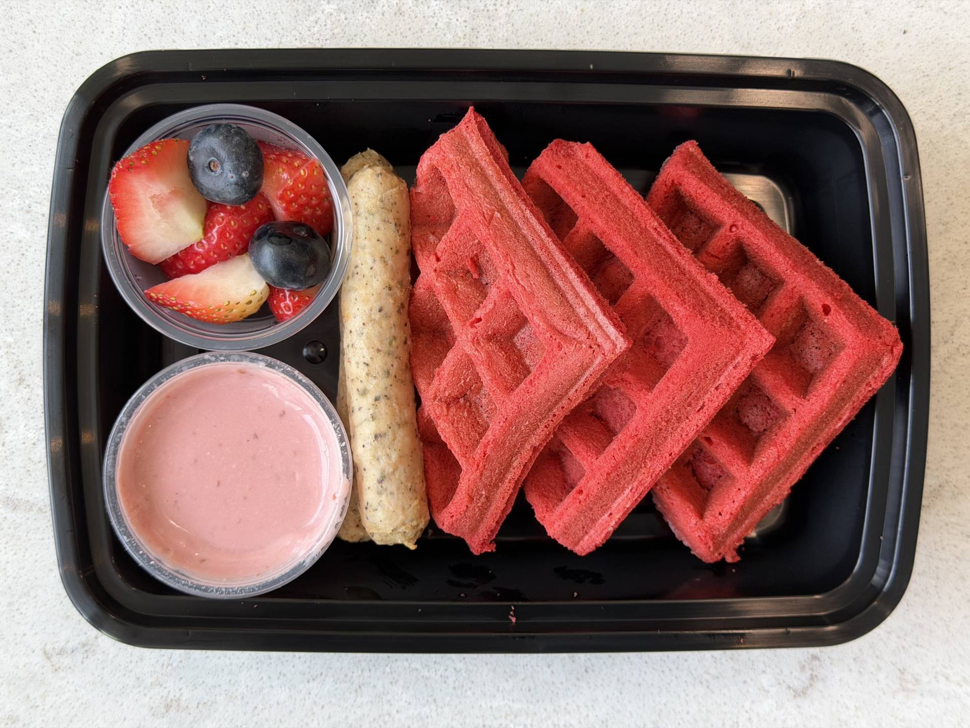 Red Velvet Protein Waffle, Chicken Sausage Links, Side of Raspberry Cream & Fresh Berries