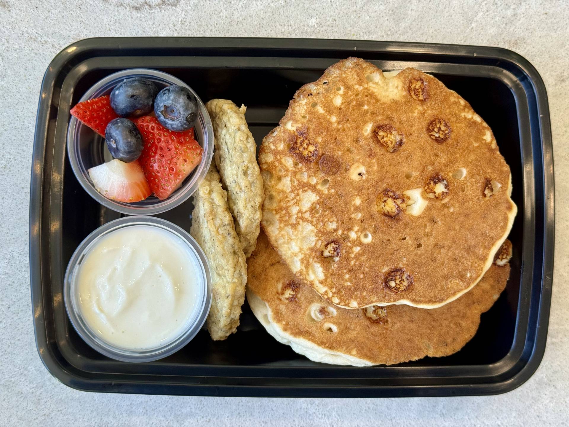Protein Pancakes, White Chocolate Chips, Chicken Sausage Links, Non Fat Greek Yogurt, Fresh Berries.