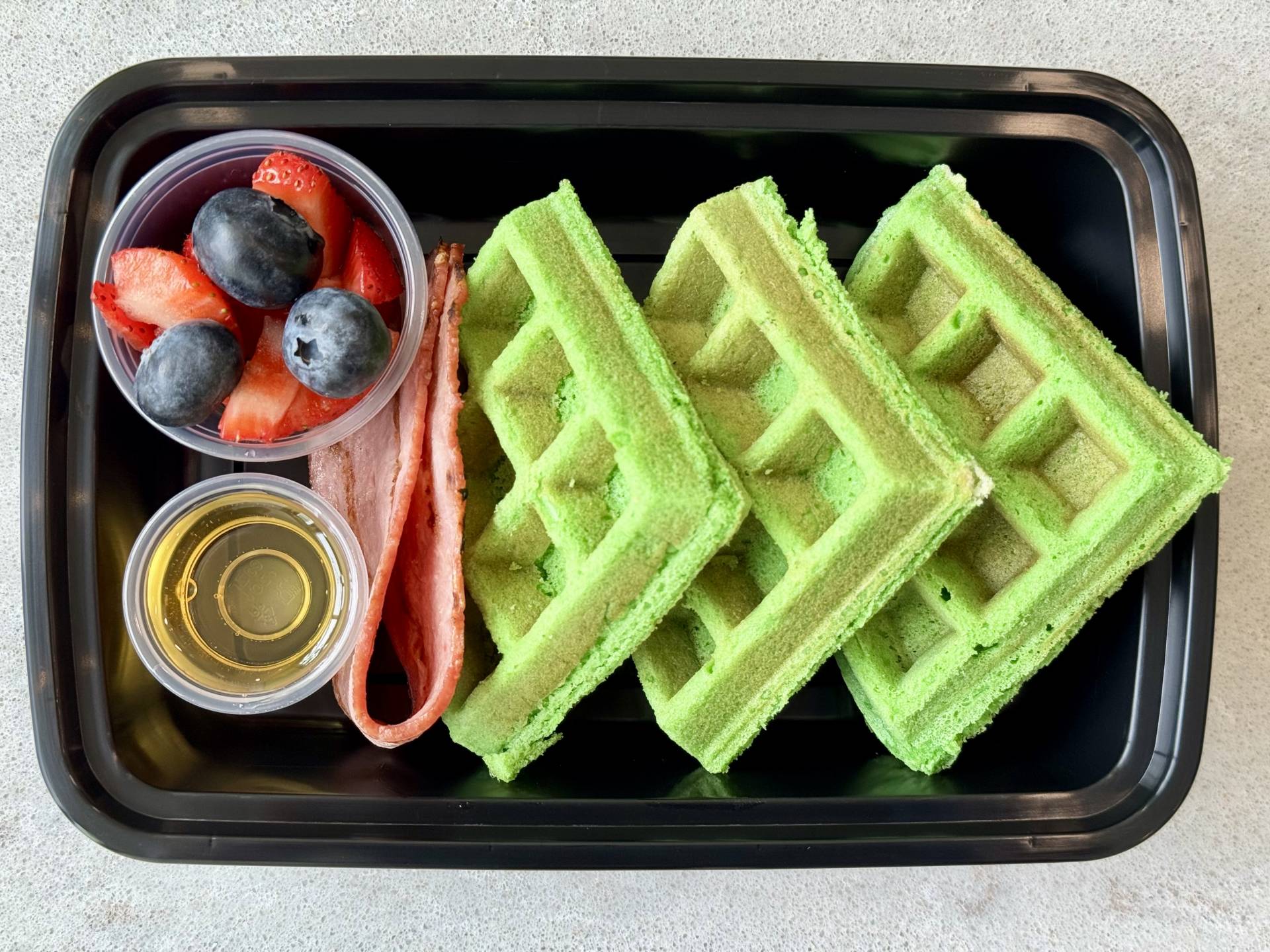Protein Waffles infused with Spinach, Turkey Bacon, Fresh Fruit, Organic Agave.