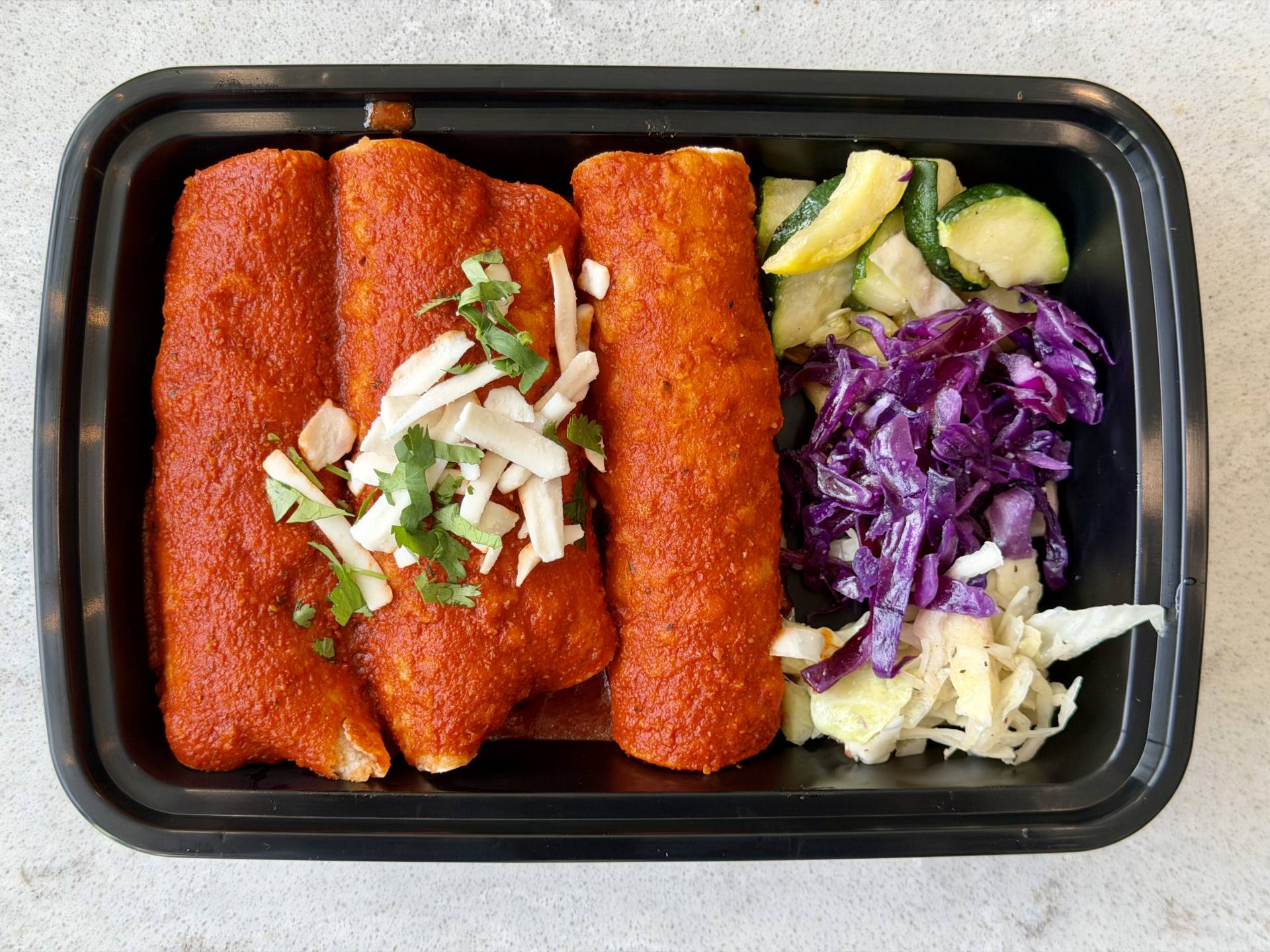 Corn Tortilla, Vegan Chorizo, Vegan Cheese, Zucchini, Cabbage, Red Sauce on Top.