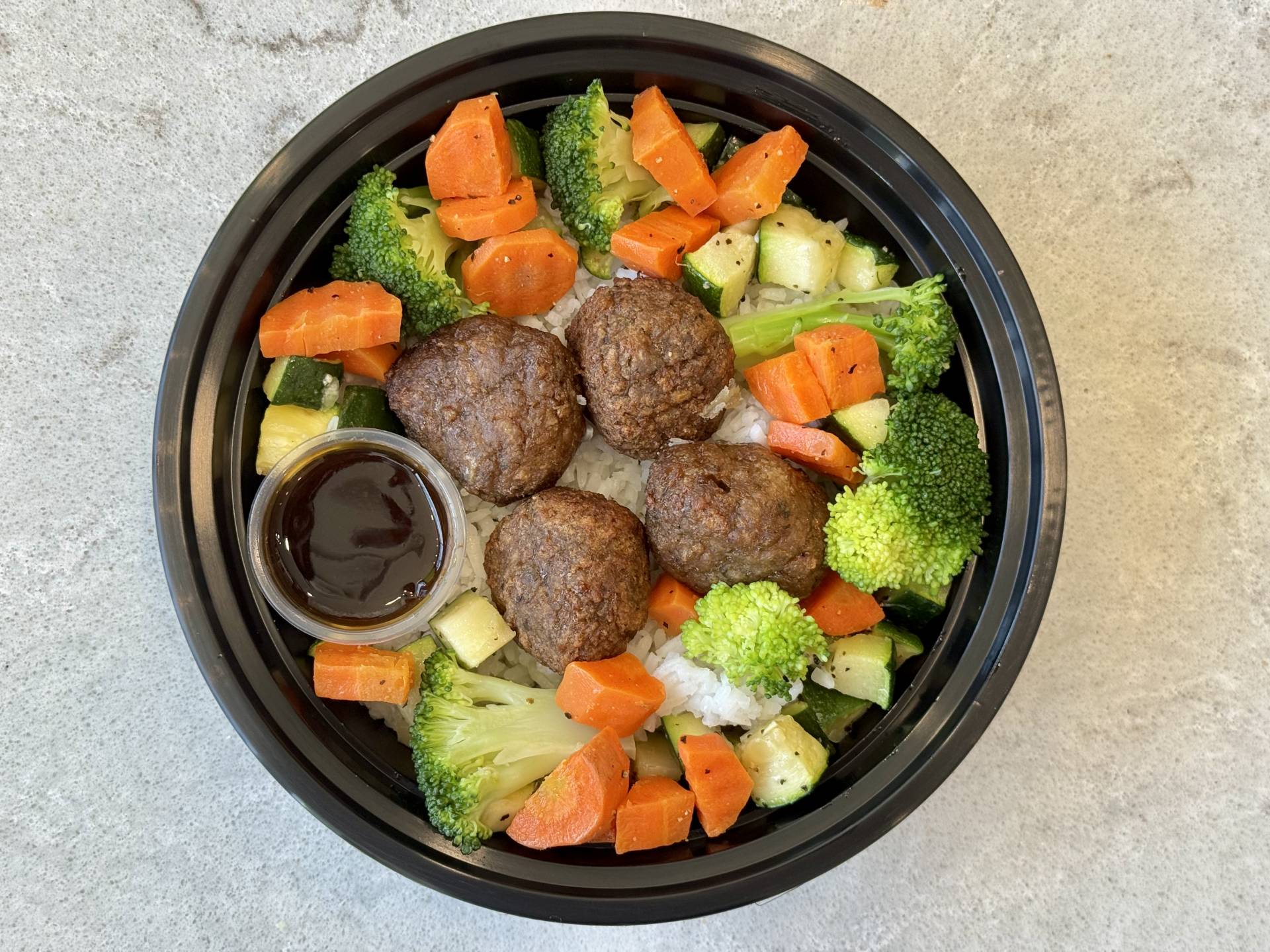 Beyond Plant Based Meatballs, White Rice, Carrots, Zucchini, Broccoli Side of Teriyaki Glaze