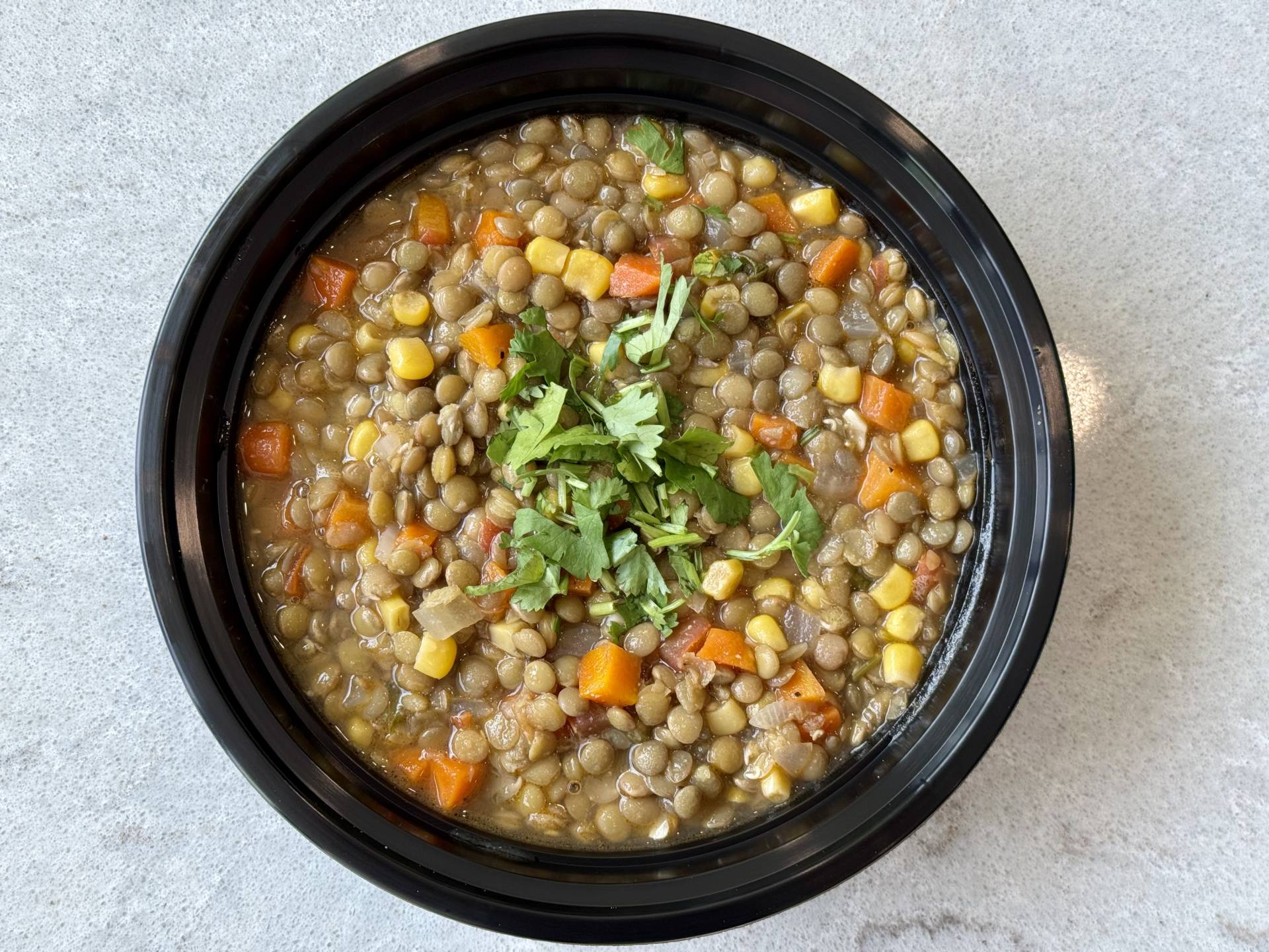 Cooked Lentils in Vegetable Broth, Onion, Tomato, Corn Carrots, Cilantro on Top