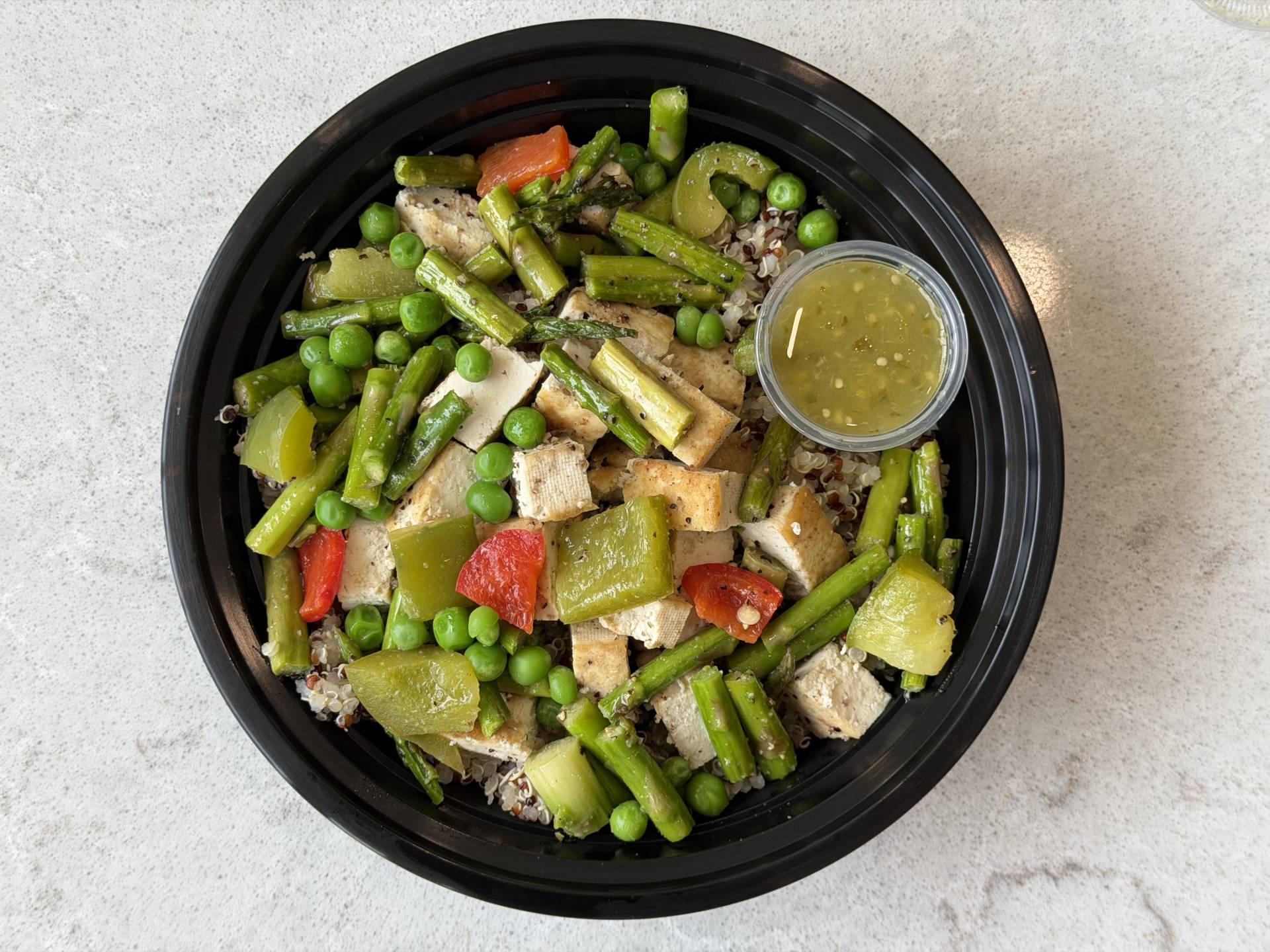 Grilled Tofu, Brown Rice, Quinoa, Asparagus, Bell Peppers, Peas, Side of Green House Sauce.