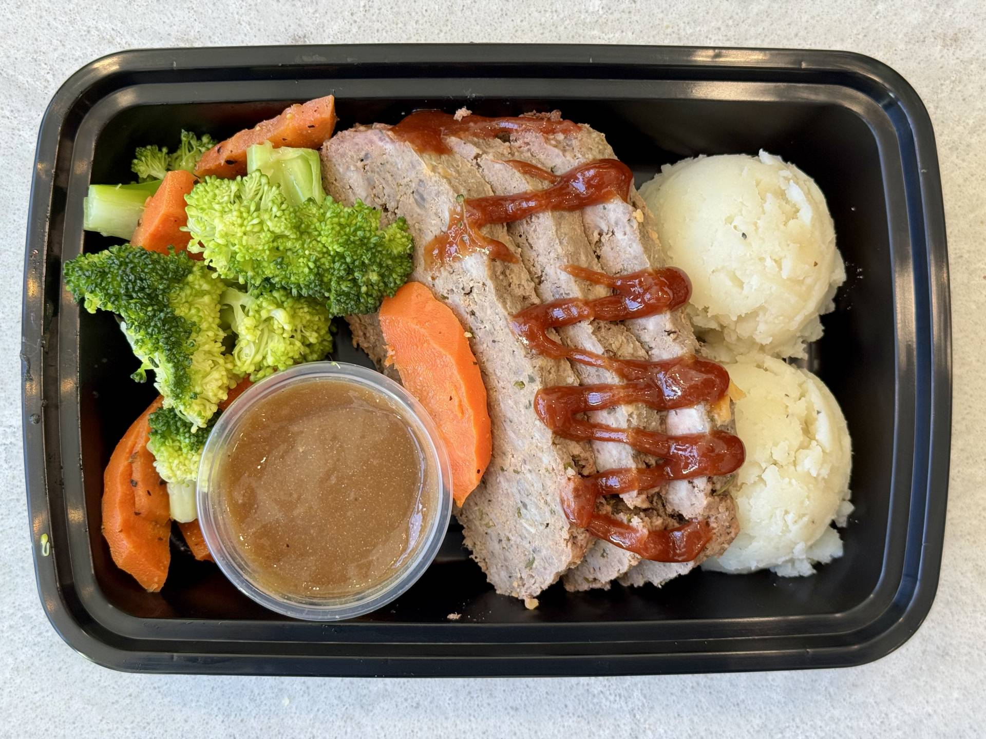 Ground Beef Meatloaf, Mashed Potatoes, Carrots, Broccoli, Ketchup Glaze, Brown Gravy on the Side