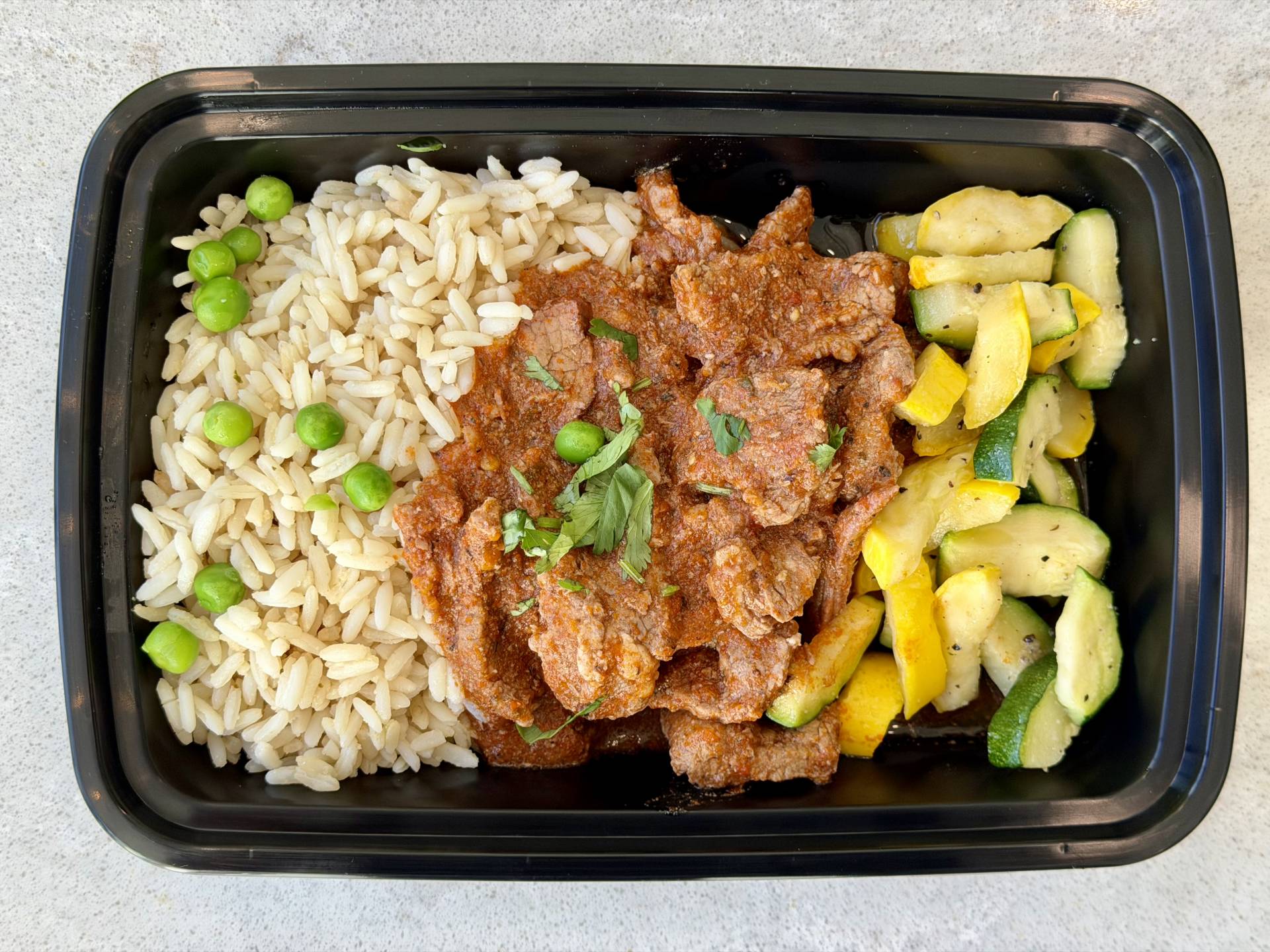 Cooked Steak in Borracho Sauce (Tomato, Jalapeño and Bell Peppers Based Sauce), Original Rice with Peas, Zucchini, Yellow Squash, Cilantro.