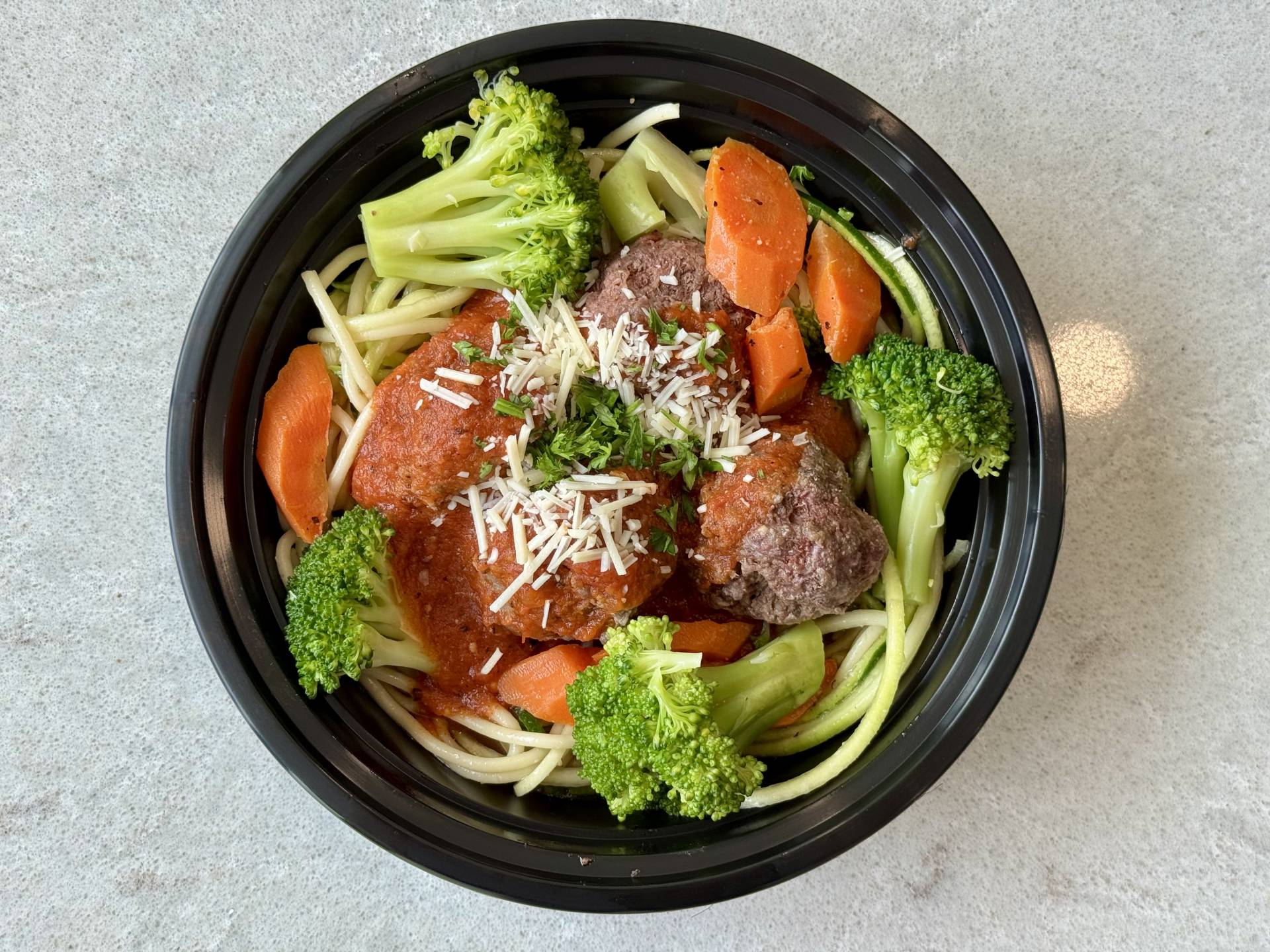 Ground Beef Meatballs, Spaghetti Pasta, Carrots, Broccoli, Tomato Sauce o Top, Side of Parmesan Cheese