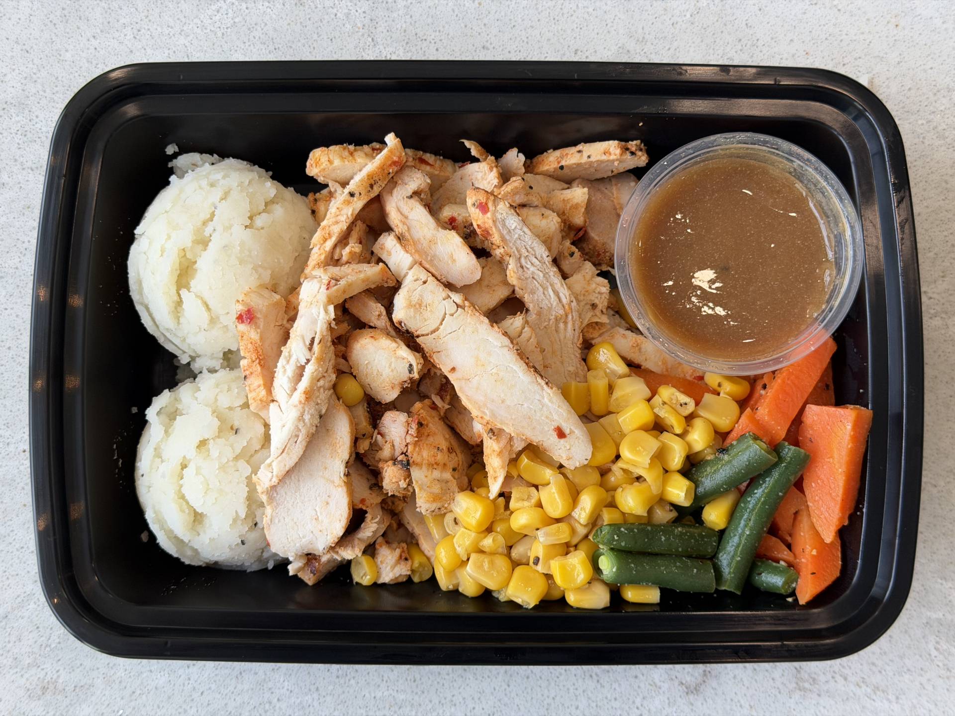 Grilled Chicken, Mashed Potatoes, Green Beans, Carrots, Corn, Gravy Sauce.