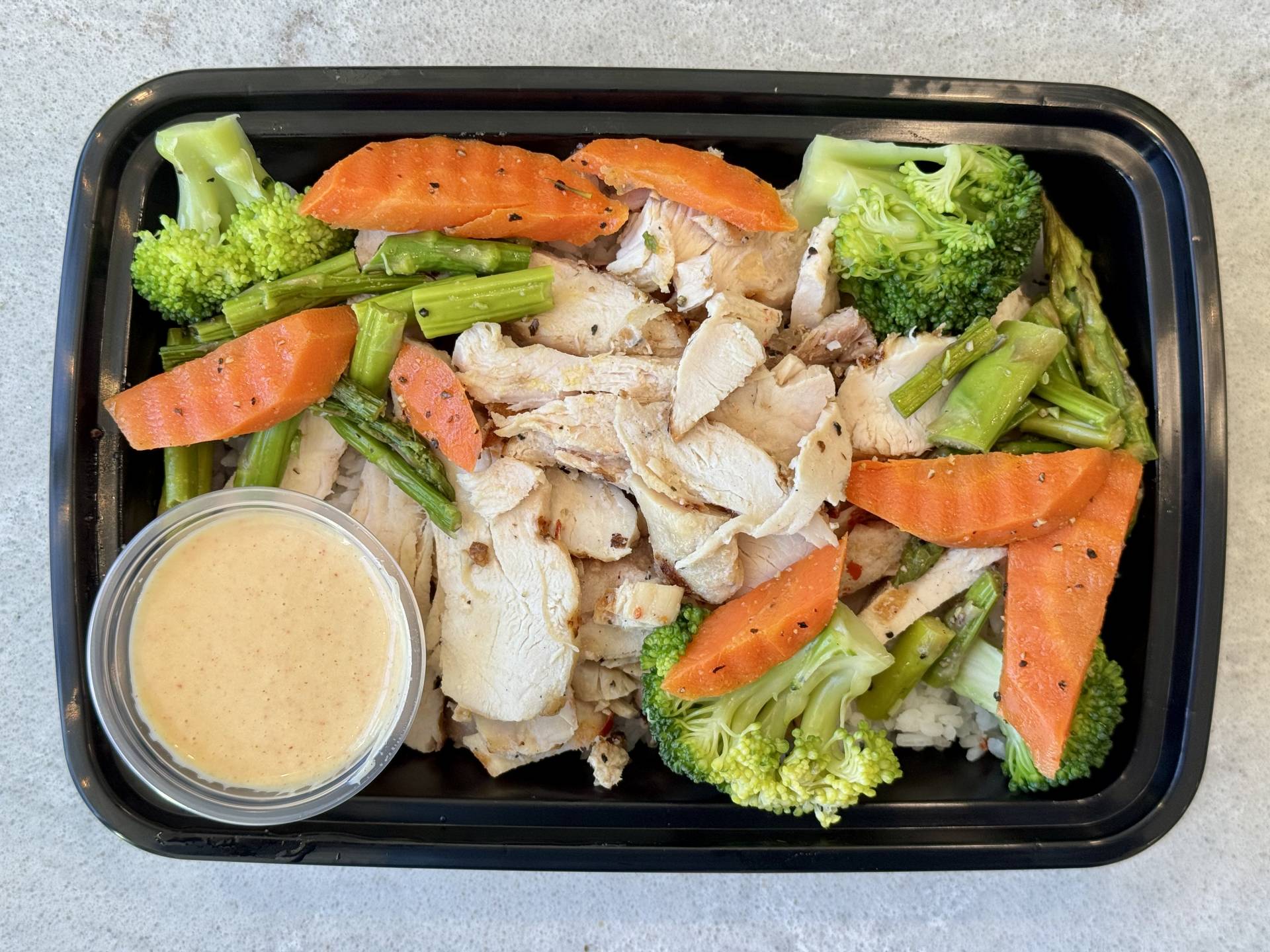 Grilled Chicken, White Rice, Carrots, Broccoli, Asparagus, Side of Honey Mustard.