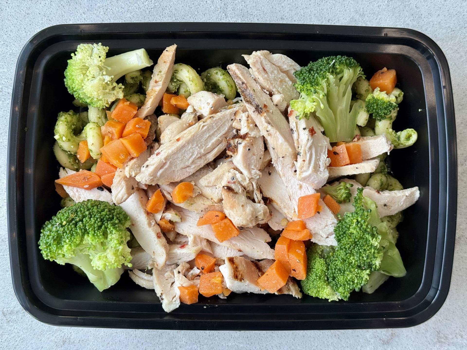 Grilled Chicken, Cavatappi Pasta, Carrots, Broccoli, Pesto Sauce on Pasta.