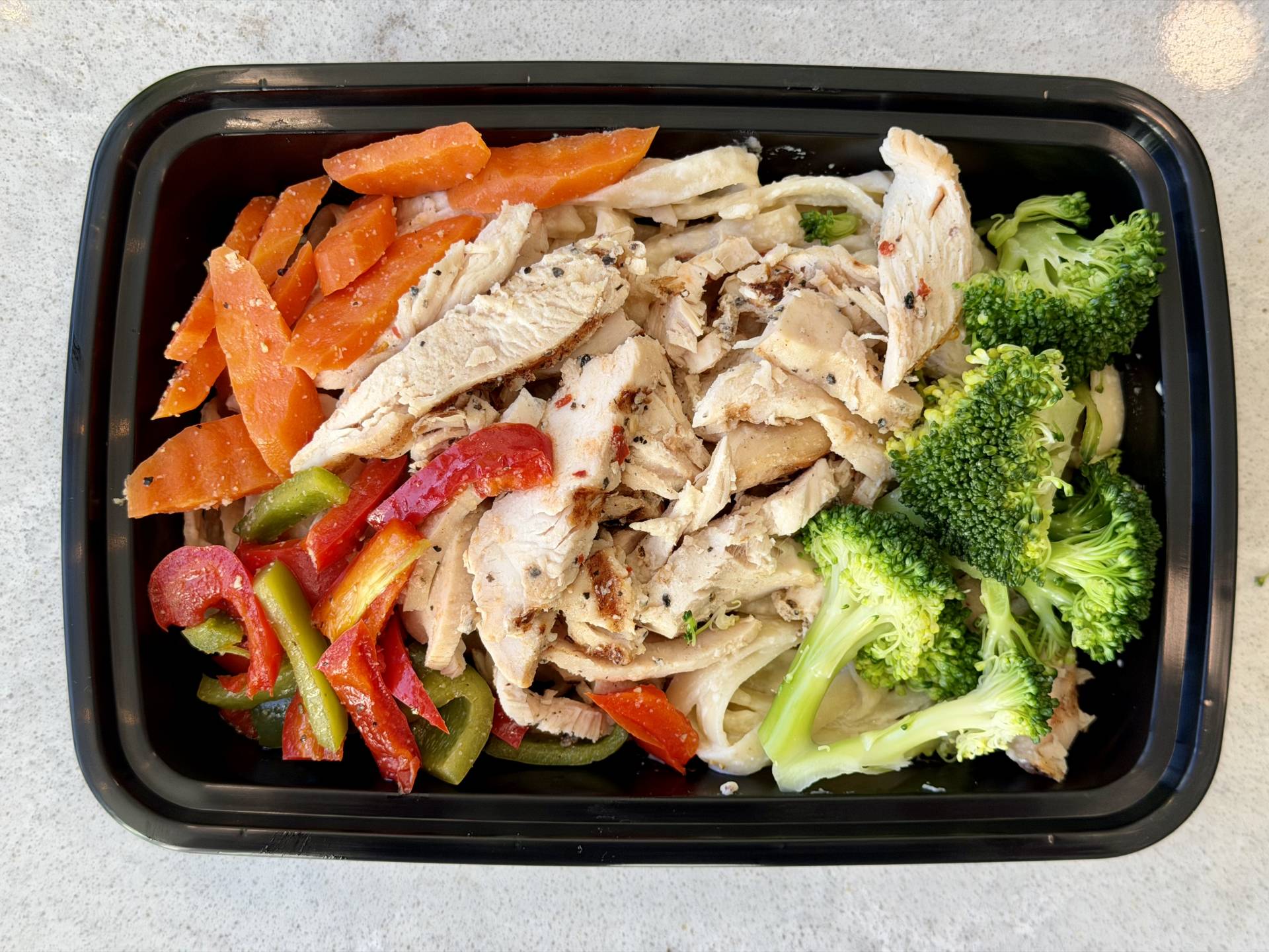 Grilled Chicken, Fettuccine Pasta with Carbonara Sauce, Broccoli, Carrots, Peppers.