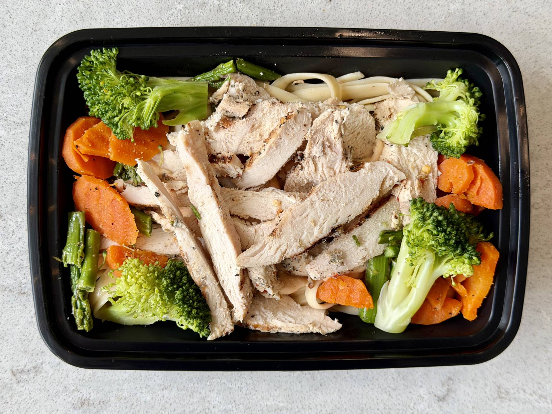 Grilled Chicken, Fettuccini Pasta, Broccoli, Carrots, Asparagus, Chipotle Alfredo Sauce on Top of Pasta