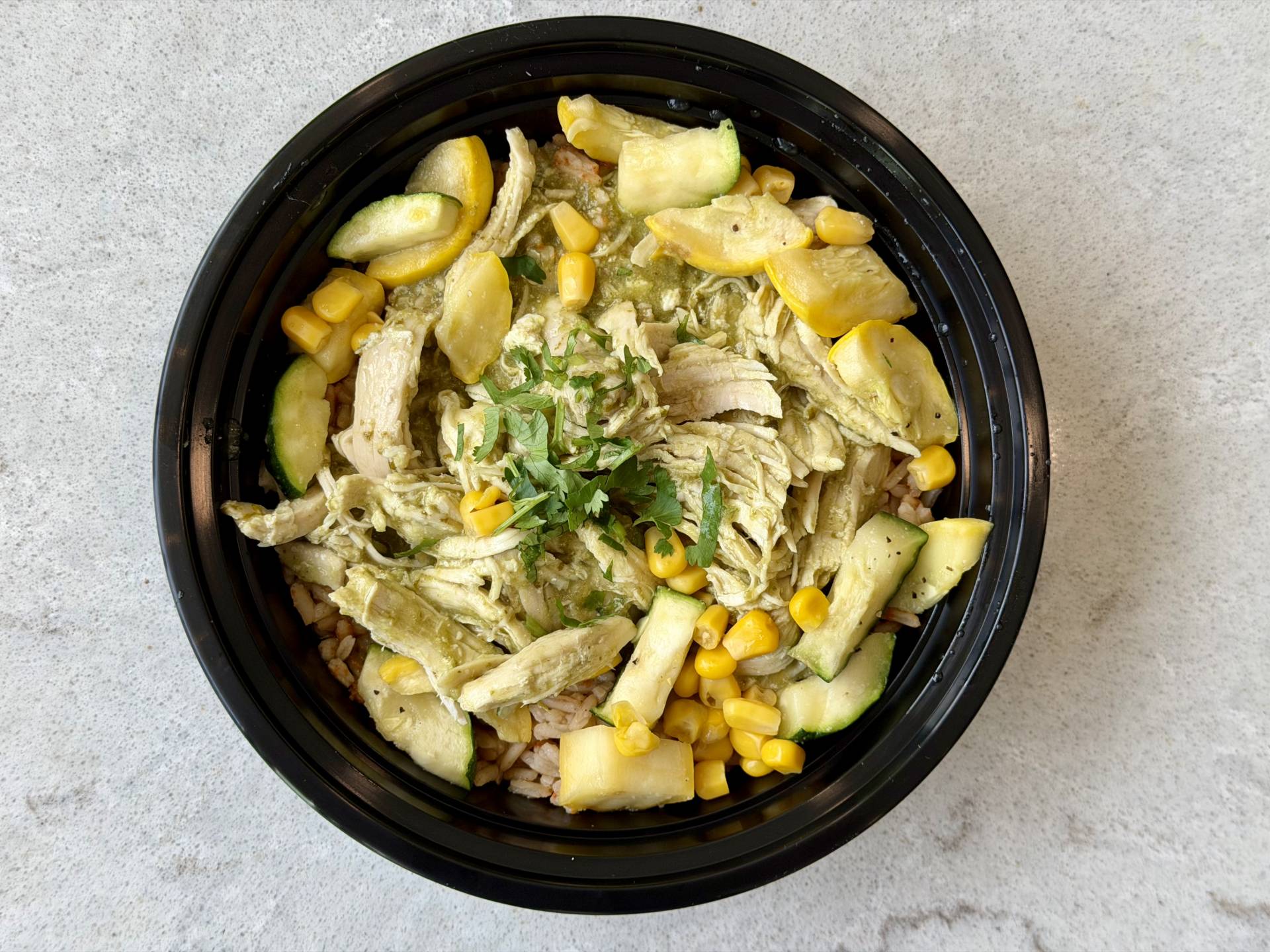 Shredded Chicken Cooked in Creamy Green Sauce, Original Rice with Corn, Squash, Zucchini, Cilantro.