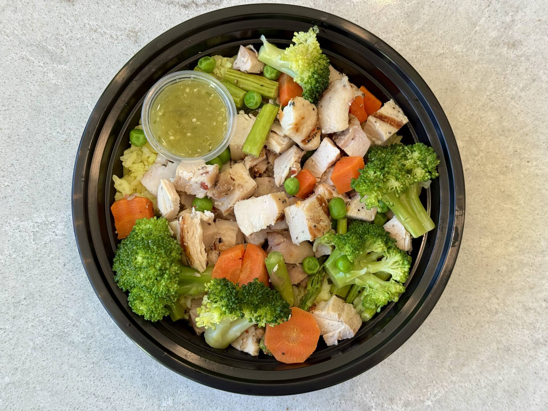 Grilled Chicken, Turmeric Rice, Carrots, Peas, Broccoli, Peppers, Cilantro, House Sauce on the Side