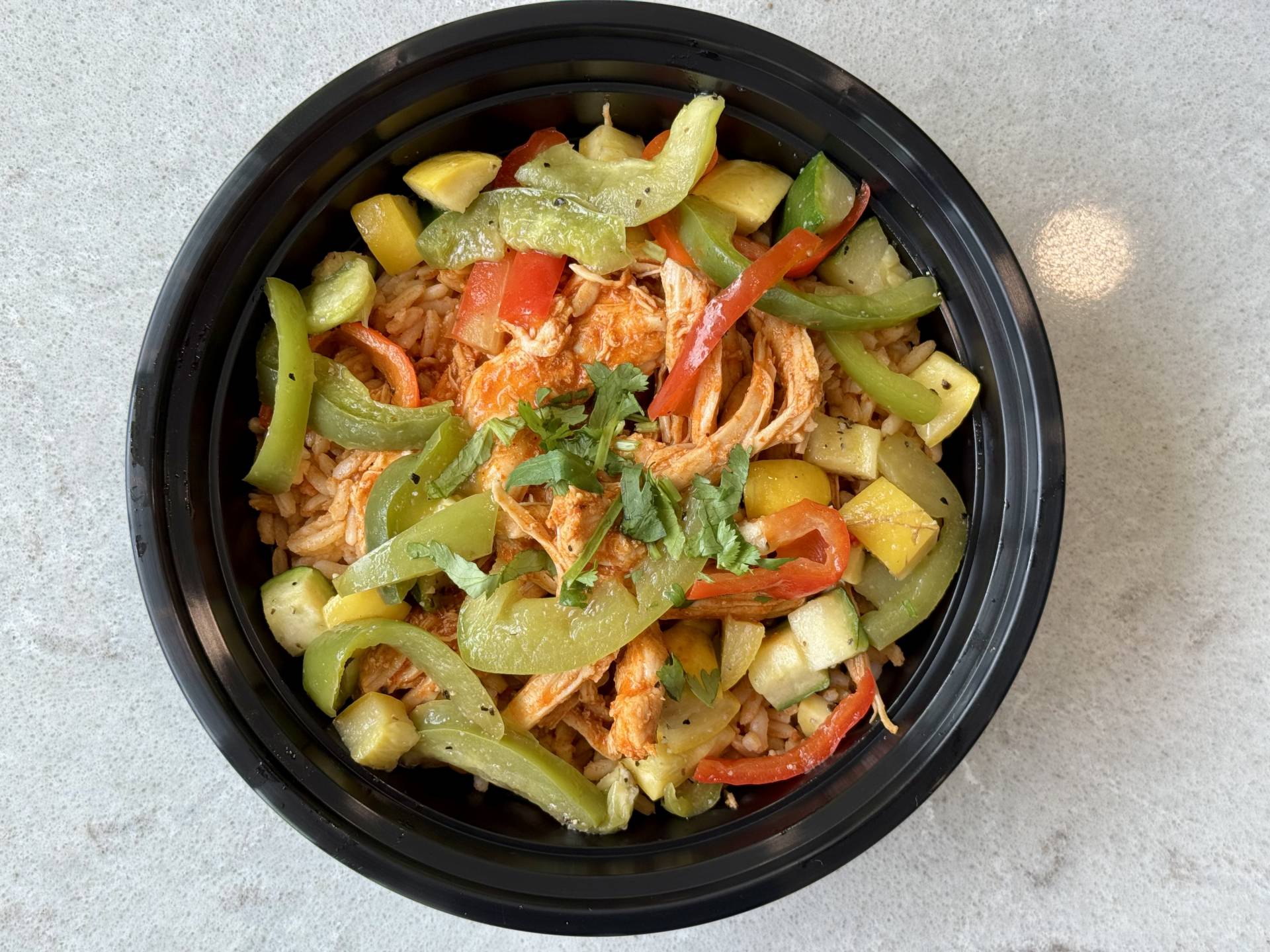 Shredded Chicken cooked in Guajillo Sauce, Original Rice, Zucchini, Peppers, Yellow Squash, Cilantro