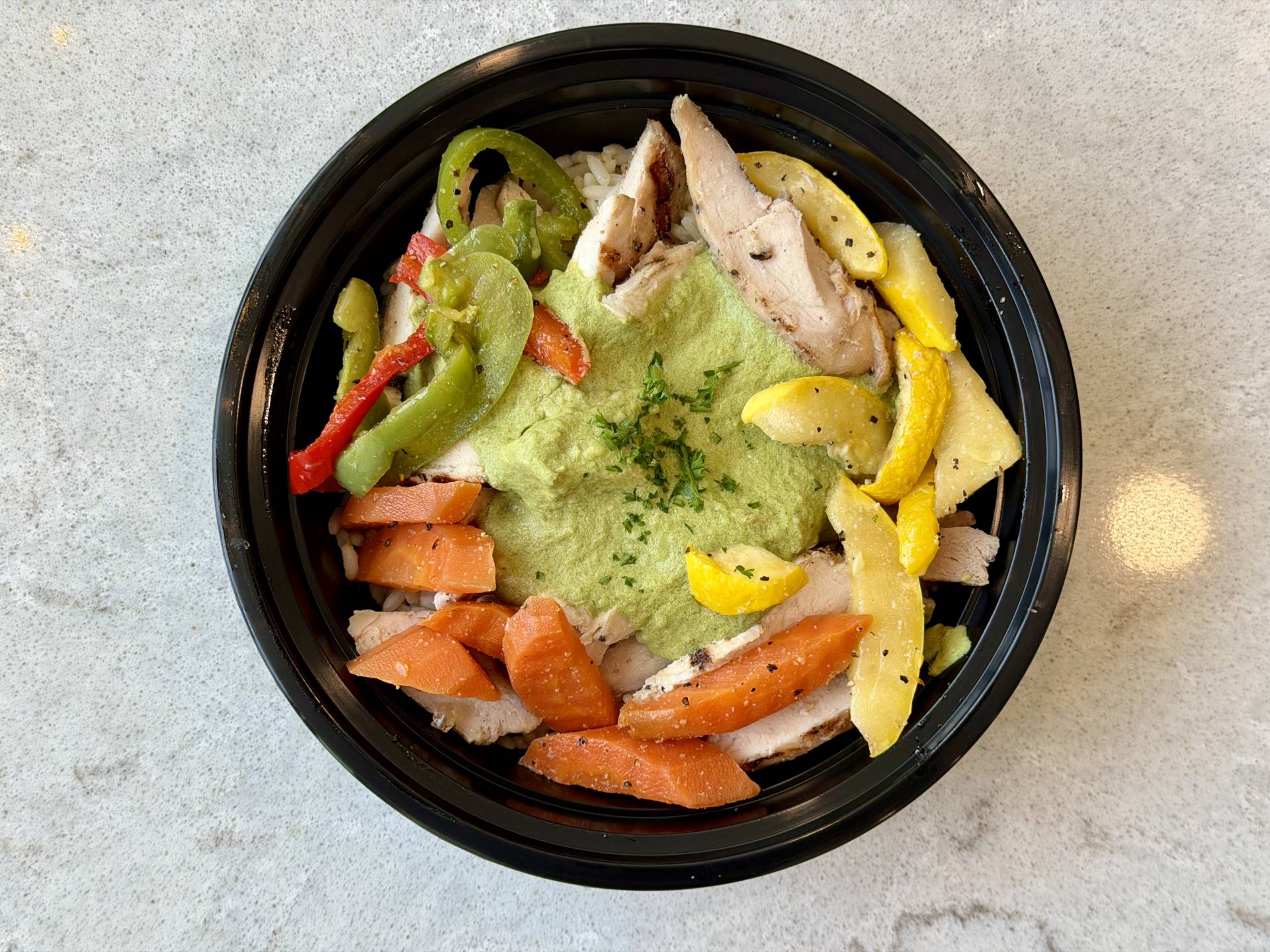 Grilled Chicken, Original Rice, Yellow Squash, Carrots, Peppers, Parsley, Cream Spinach Sauce on Top.